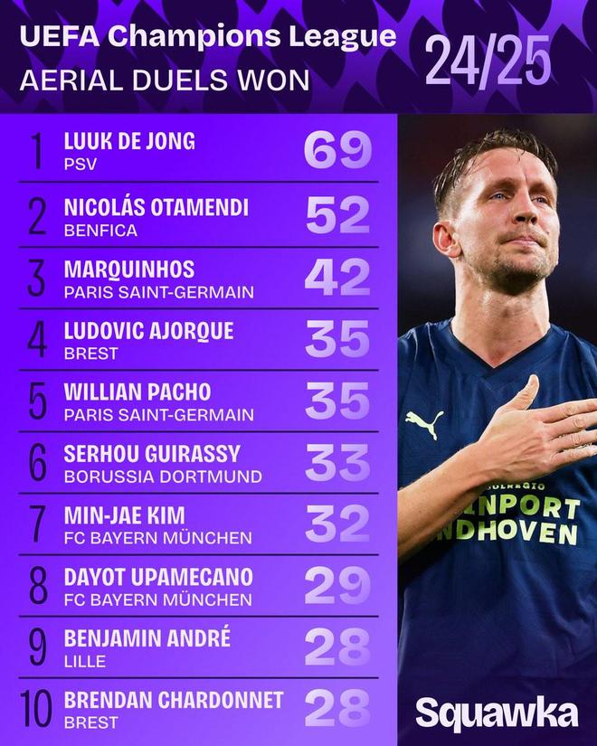 24/25赛季欧冠空中对抗成功榜:吕克-德容69次断层领先